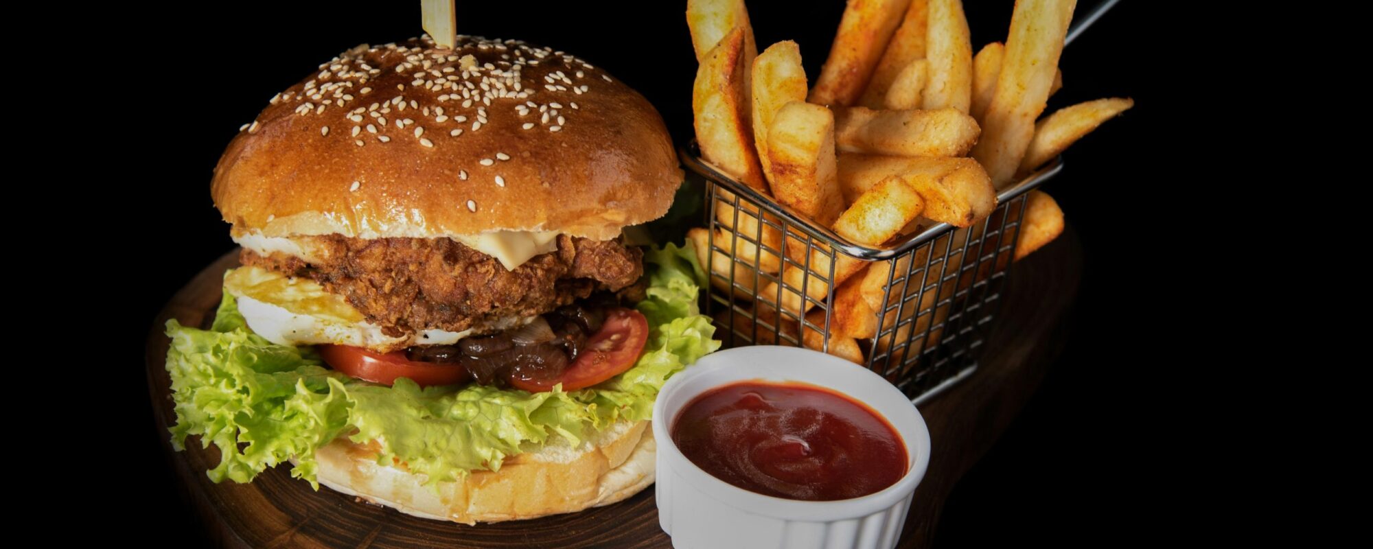 kurczak panierowany, ser cheddar, ogórek konserwowy, pomidor, czerwona cebula, sałata lodowa, 2 sosy do wyboru
